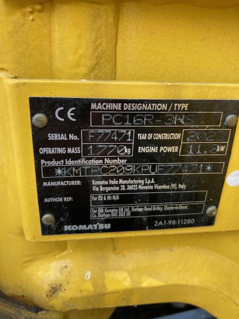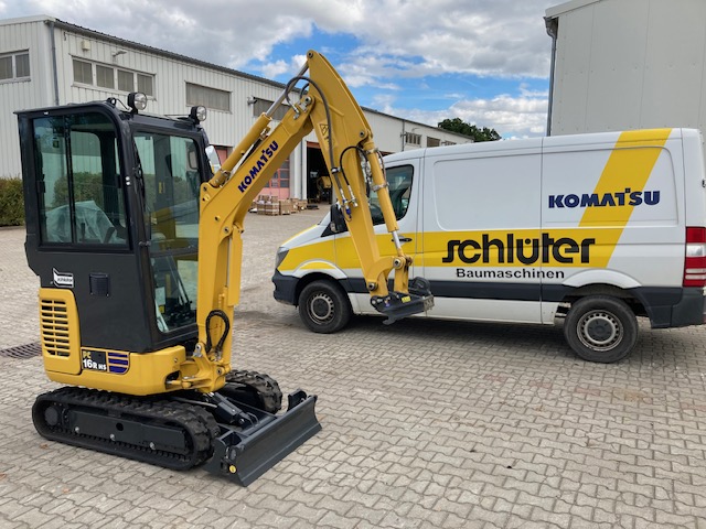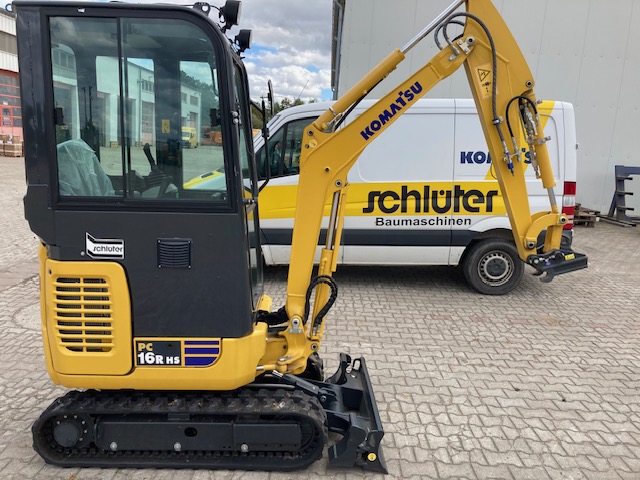 MINI-EXCAVATOR KOMATSU PC 16 R-3 HS (EU-5) CAB + HEATER + 1 GUIDE STD 2 TRAVEL SPEEDS WITH AUTOMATIC CONTROL (AUTO-SHIFT-DOWN) CLOSED-LOAD SENSING SYSTEM TWO-WAY AUXILIARY HYDRAULICS TO BOOM, SWITCHABLE TO HAMMER MODE DOZER BLADE WORK LIGHTS ON BOOM HYDR ADJUSTABLE UNDERCARRIAGE (HS) SWING BOOM, PROTECTIVE COVER FOR BOOM LIFT CYLINDER AUDIBLE TRAVEL ALARM CE CONFORMITY 1.760 MM MONOBLOC BOOM HYD.CIRCUIT 1,215 MM DIPPER STICK +1 GUIDE STD STANDARD COUNTERWEIGHT SPRUNG DRIVER'S SEAT 2FIX SAFETY BELT POWER/LUBRICANTS STD RUBBER TRACK (SHORT PITCH) QUICK-CHANGE PLATE MS 01, MECH WITH LOAD HOOK C201 FOOT PEDAL 2 LATERIAL MIRROR STOPCOCKS ON BUCKET CYLINDER