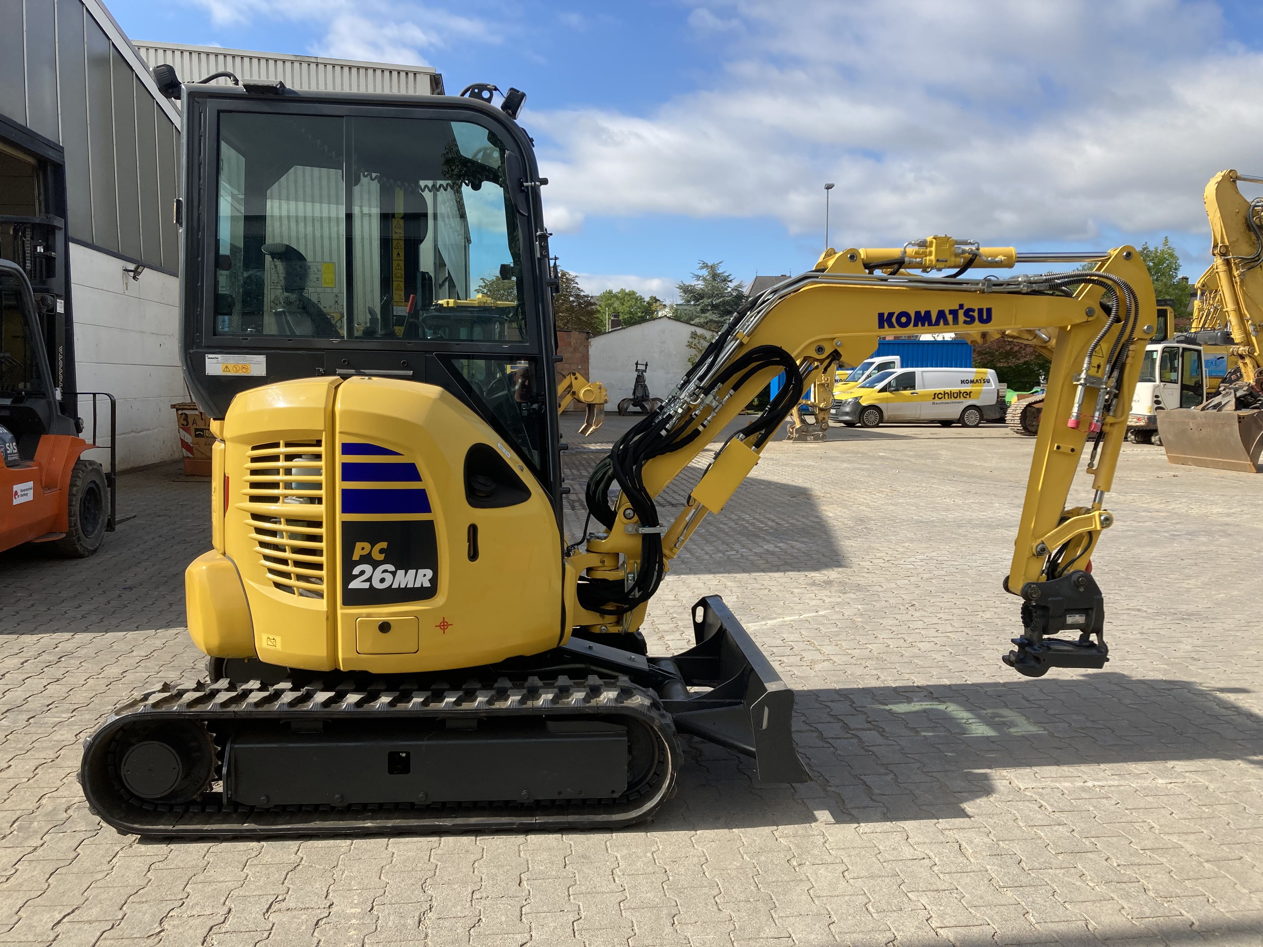 MINI EXCAVATOR KOMATSU PC 26 MR-5 (EU-5) PATTERN D CAB + HEATER + PWRT LINE 2 TRAVEL SPEEDS AND AUTO-SHIFT-DOWN SERVO PILOT CONTROL SLEWING BOOM 2-WAY AUXILIARY HYDRAULICS UP TO BOOM (SWITCHABLE TO HAMMER MODE) PROTECTIVE COVER ON BOOM LIFT CYLINDER WORK LIGHTS ON BOOM DOZER BLADE INTEGRATED COUNTERWEIGHT AUDIBLE TRAVEL ALARM TOOL KIT CONFORMITY ACCORDING TO CE DIRECTIVES CAB + HEATER + 1 + 2 LINES EPC 1.950 MM MONOBLOC BOOM + 4 LINES 1,115 MM DIPPER+PWT-LEIT+SW-LEIT GRAMMER SEAT F CAB VERSION STD FUELS/LUBRICANTS RUBBER TRACK POWERTILT PTS030 WITH QUICK COUPLER HS 03,HYDRAULIC AND LOAD HOOK C203 4 LED- HEADLIGHTS (2X CAB FRONT + 1X REAR + 1X EXTERNAL) RADIO ACCESSORIES + RADIO