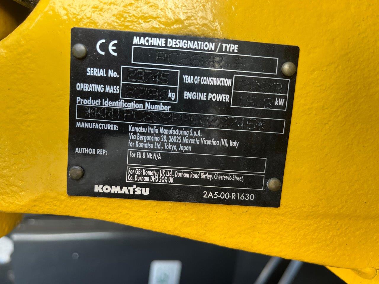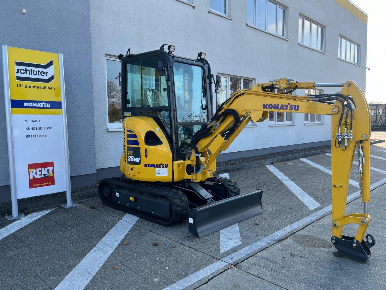 MINI EXCAVATOR KOMATSU PC 26 MR-5 (EU-5), PATTERN C (V2), 2 SPEEDS AND AUTO-SHIFT-DOWN, SERVO PILOT CONTROL, SWING BOOM, 2-WAY AUXILIARY HYDRAULICS TO BOOM, (SWITCHABLE TO HAMMER MODE), PROTECTIVE COVER ON BOOM LIFT CYLINDER, WORK LIGHTS ON BOOM, DOZER BLADE, INTEGRATED COUNTERWEIGHT, AUDIBLE TRAVEL ALARM, TOOL KIT, CONFORMITY ACCORDING TO CE DIRECTIVES, CAB + HEATING + 2.PROP LINES, FOR HYDR ATTACHMENTS, 1,950 MM MONOBLOC BOOM, 1,370 MM DIPPER ARM + 2 EPC LINES, SUSPENDED DRIVER'S SEAT WITH 2"" FIXED, SAFETY HARNESS, STD FUEL/LUBRICANTS, RUBBER TRACK, 4 LED HEADLIGHTS, (2X CAB FRONT + 1X REAR + 1X EXTERNAL), QUICK-CHANGE PLATE MS 03, MECH, PRESSURE RELIEF VALVE