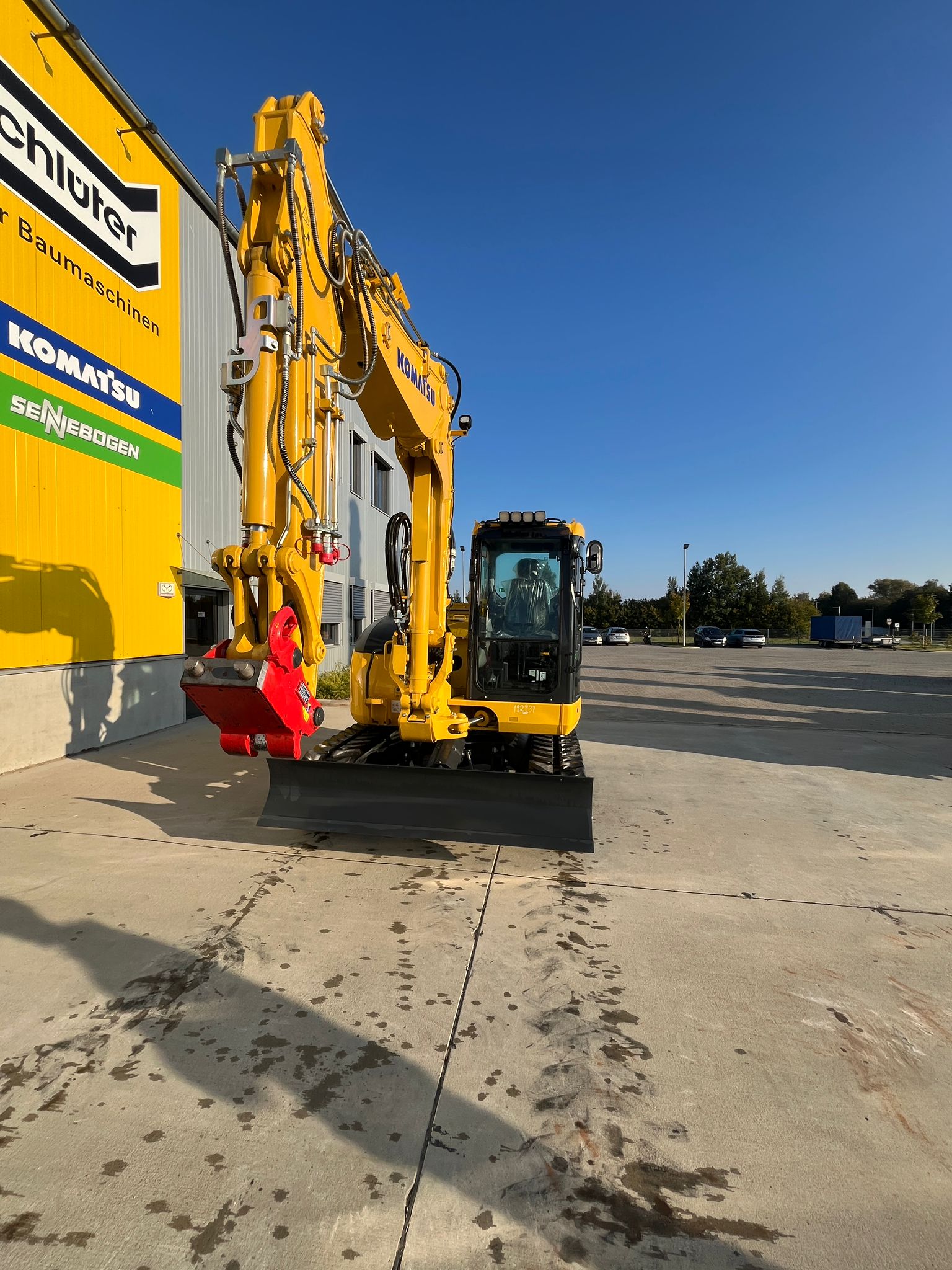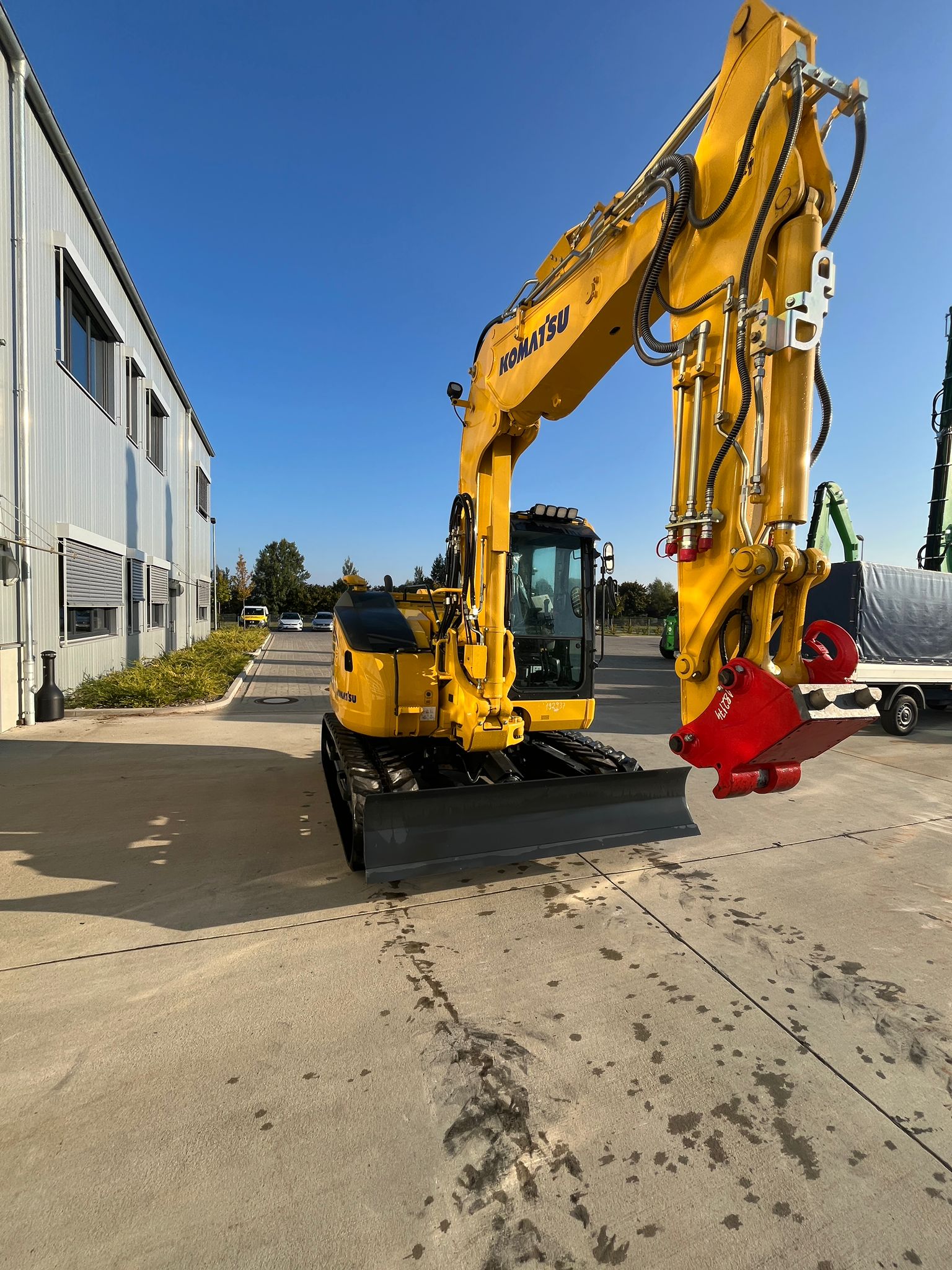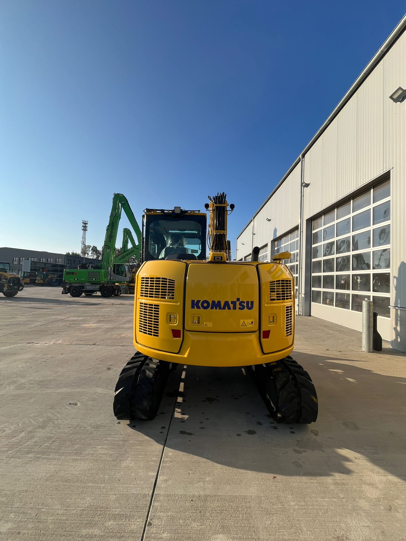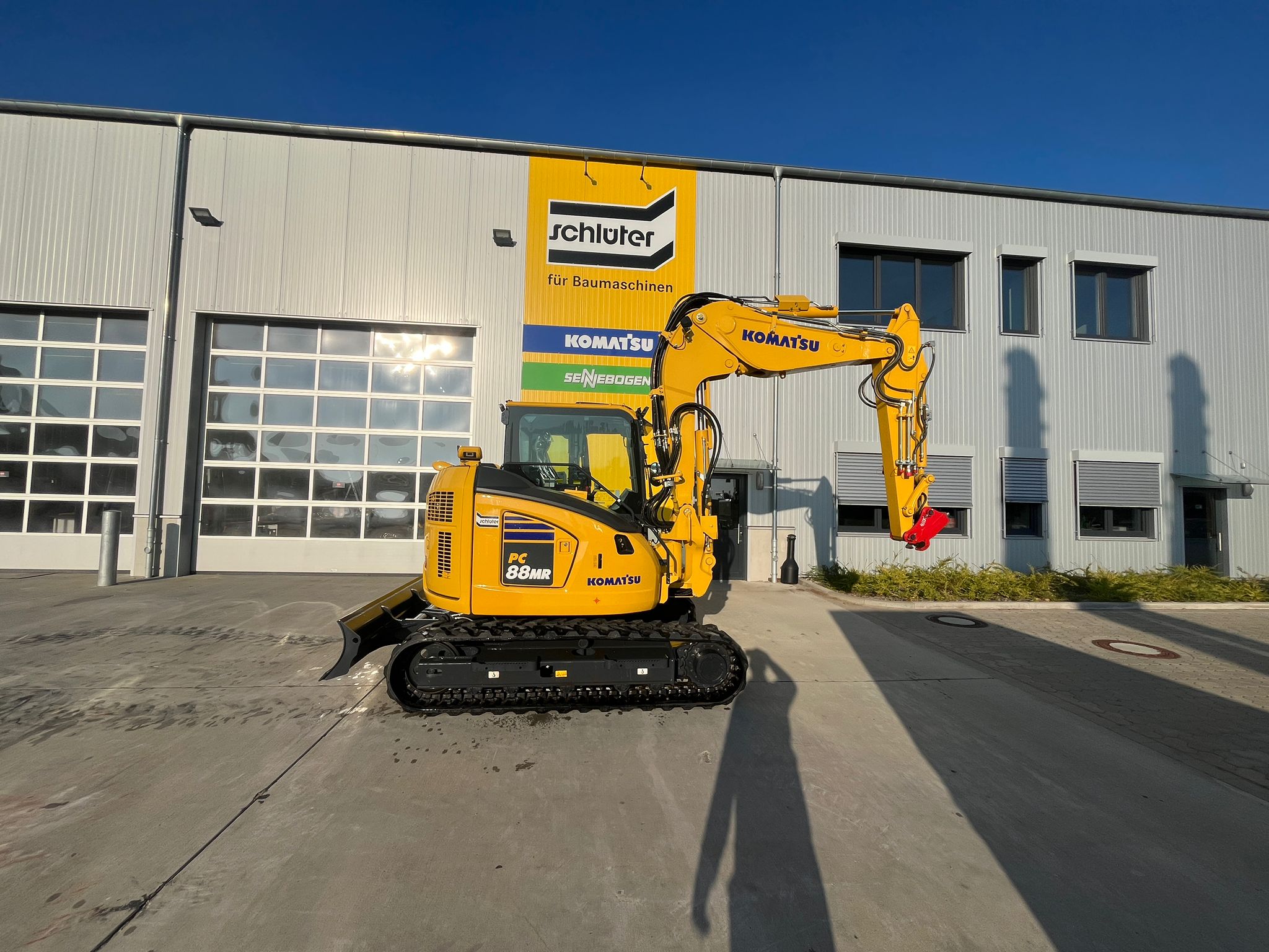 MINI EXCAVATOR KOMATSU PC 88 MR-11E0 PATTERN F REINFORCED SPACE CAB (ROPS, OPG LEVEL 1) WITH OVERPRESSURE AND VIBRATION-DAMPED MOUNTING, AS WELL AS TINTED SAFETY GLASS PANES SLIDING WINDSHIELD WITH LATCHING POSITION AND REMOVABLE LOWER BARN,LARGE ROOF WINDOW WINDSHIELD WIPER WITH INTERMITTENT SWITCH 24V CIGARETTE LIGHTER ASHTRAY MAGAZINE HOLDER, 24V POWER CONNECTION CUP HOLDER, FLOOR MATS, HANDRAILS AUTOMATIC AIR CONDITIONING, SLIDING DOOR, KOMTRAX GPRS HEATED AIR-SUSPENDED DRIVER'S SEAT WITH ADJUSTABLE HEIGHT, LUMBAR SUPPORT, AIR CONDITIONING AND AIR CONDITIONING.HEIGHT,LUMBAR SUPPORT ADJUSTABLE ARMRESTS,AUTOMATIC SAFETY BELT ENGINE SHUTDOWN,SAFETY WARNING IN THE CAB,OVERLOAD WARNING DEVICE SLEWING BOOM (53° LEFT/67° RIGHT) SAFETY VALVE ON BOOM LIFT AND BUCKET STICK CYLINDER RADIO PREPARATION,AUDIBLE DRIVING ALARM TANK AND HOODS LOCKABLE REMOTE LUBRICATION FOR SLEWING GEAR UBOLT COUNTERWEIGHT,TOOLBOX 2 X LED WORK LIGHTS ON THE BOOM (RIGHT AND LEFT SIDE) 4 X LED WORK LIGHTS AT THE FRONT OF THE CAB ROOF LED WORK LIGHTS AT THE REAR OF THE CAB ROOF,ROTATING BEACON ON CAB ROOF RAIN PROTECTION (FRONT ON CAB ROOF) LEFT LATERAL MIRROR ON CAB REAR-VIEW MIRROR ON CAB ROOF HIGH-RESOLUTION REVERSING CAMERA INTEGRATED IN HOOD SIDE CAMERA (RIGHT) (WITH AUTOMATIC SWITCH-OFF) TOOL KIT, CE-COMPLIANT RUBBER TRACK + DOZER BLADE ADJUSTABLE BOOM (2 LINES) 1.900 MM DIPPER ARM HCU D (2 LINES) FUELS/LUBRICANTS STD DAB RADIO