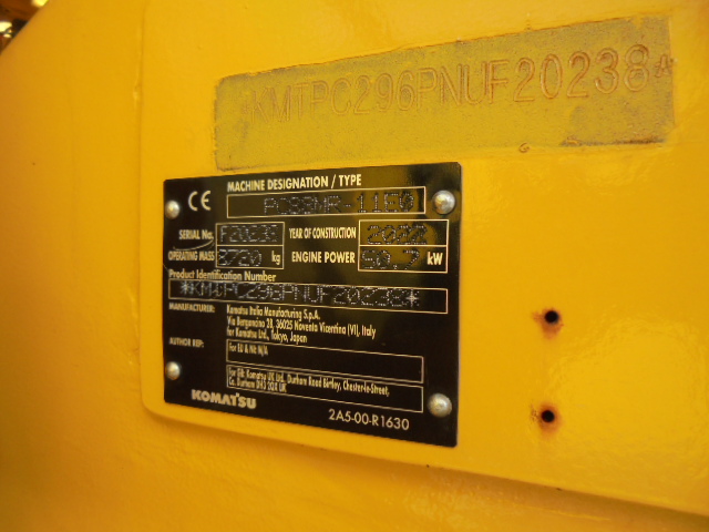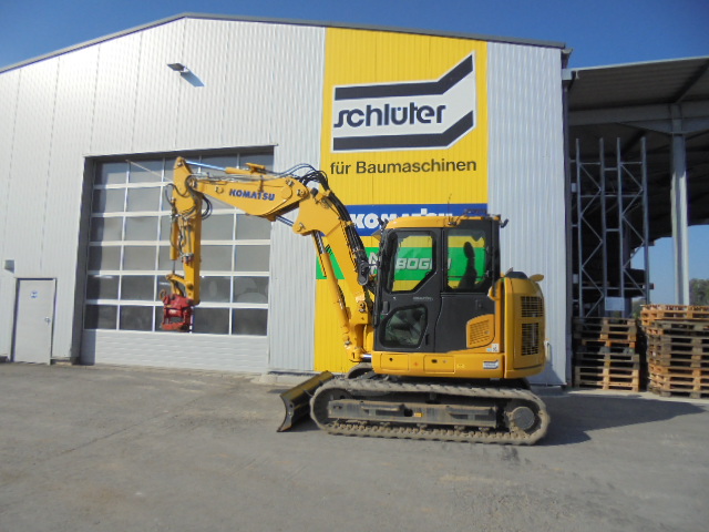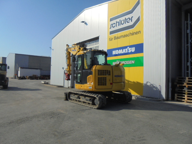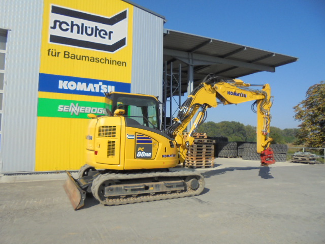 MINI EXCAVATOR KOMATSU PC 88 MR-11E0, PATTERN F, 3-CYLINDER KOMATSU ENGINE, 68 HP, OPERATING WEIGHT: 9.0 TO, REINFORCED SPACE CAB (ROPS, OPG LEVEL 1) WITH OVERPRESSURE AND, VIBRATION-DAMPED MOUNTING, AS WELL AS, TINTED SAFETY GLASS WINDOWS, SLIDING WINDSHIELD WITH LATCHING POSITION AND REMOVABLE LOWER, WINDOW, LARGE SKYLIGHT, WINDSHIELD WIPER WITH INTERVAL SWITCH, 24V CIGARETTE LIGHTER, ASHTRAY, MAGAZINE HOLDER, 24V POWER CONNECTION, CUP HOLDER, FLOOR MATS, HANDRAILS, AUTOMATIC AIR CONDITIONING, SLIDING DOOR, KOMTRAX GPRS, HEATED AIR-SUSPENDED DRIVER'S SEAT, WITH ADJUSTABLE HEIGHT, LUMBAR SUPPORT, AIR CONDITIONING.HEIGHT, LUMBAR SUPPORT, ADJUSTABLE ARMRESTS, AUTOMATIC SAFETY BELT, ENGINE SHUTDOWN, SAFETY WARNING SIGN IN THE CAB, OVERLOAD WARNING DEVICE, SLEWING BOOM (53° LEFT/67° RIGHT), SAFETY VALVE ON BOOM LIFT AND DIPPERSTICK CYLINDER, RADIO PREPARATION, AUDIBLE DRIVING ALARM, LOCKABLE TANK AND HOODS, REMOTE LUBRICATION FOR SLEWING GEAR, COUNTERWEIGHT, TOOLBOX, 2 X LED WORK LIGHTS ON BOOM, (RIGHT AND LEFT SIDE), 4 X LED WORK LIGHTS AT THE FRONT OF THE CAB ROOF, LED WORK LIGHTS AT THE REAR OF THE CAB ROOF, RAIN GUARD (AT THE FRONT OF THE CAB ROOF), LEFT SIDE MIRROR ON THE CAB, REAR VIEW MIRROR ON THE CAB ROOF, HIGH-RESOLUTION REVERSING CAMERA INTEGRATED IN THE HOOD, SIDE CAMERA (RIGHT), FUEL TANK WITH REFUELING PUMP, (WITH AUTOMATIC SHUT-OFF), RUBBER TRACK + DOZER BLADE, ADJUSTABLE BOOM, 1.900 MM DIPPER STICK, FUEL/LUBRICANTS STD, RADIO, POWERTILT SLEWING DEVICE PTS100 WITH, HS 08 DL QUICK COUPLER, LOAD HOOK C205, 080 CM BACKHOE BUCKET MS 08 CTL5, SYMLOCK, TEETH