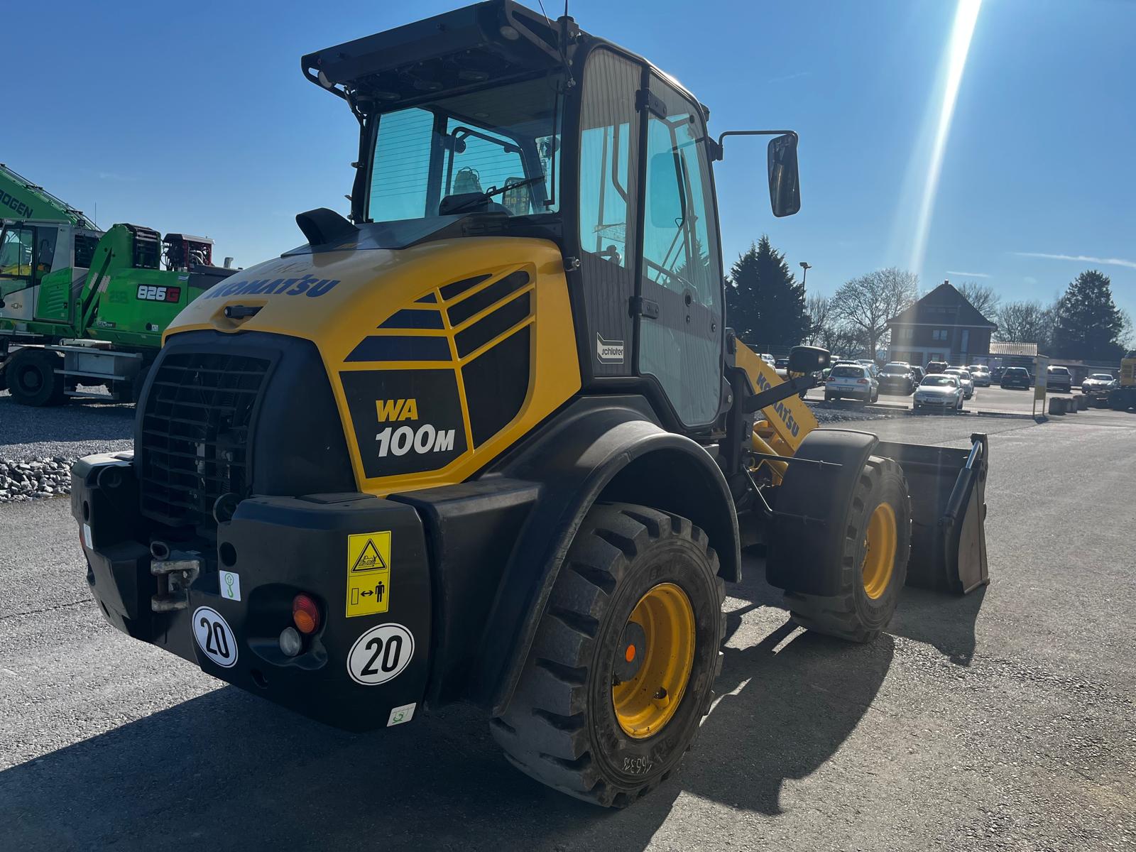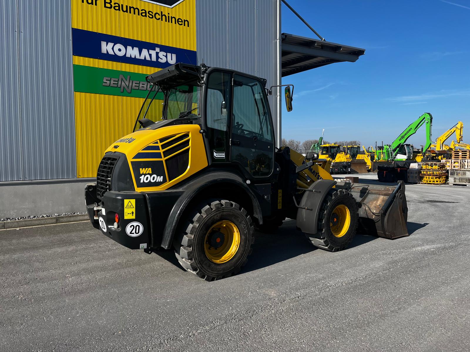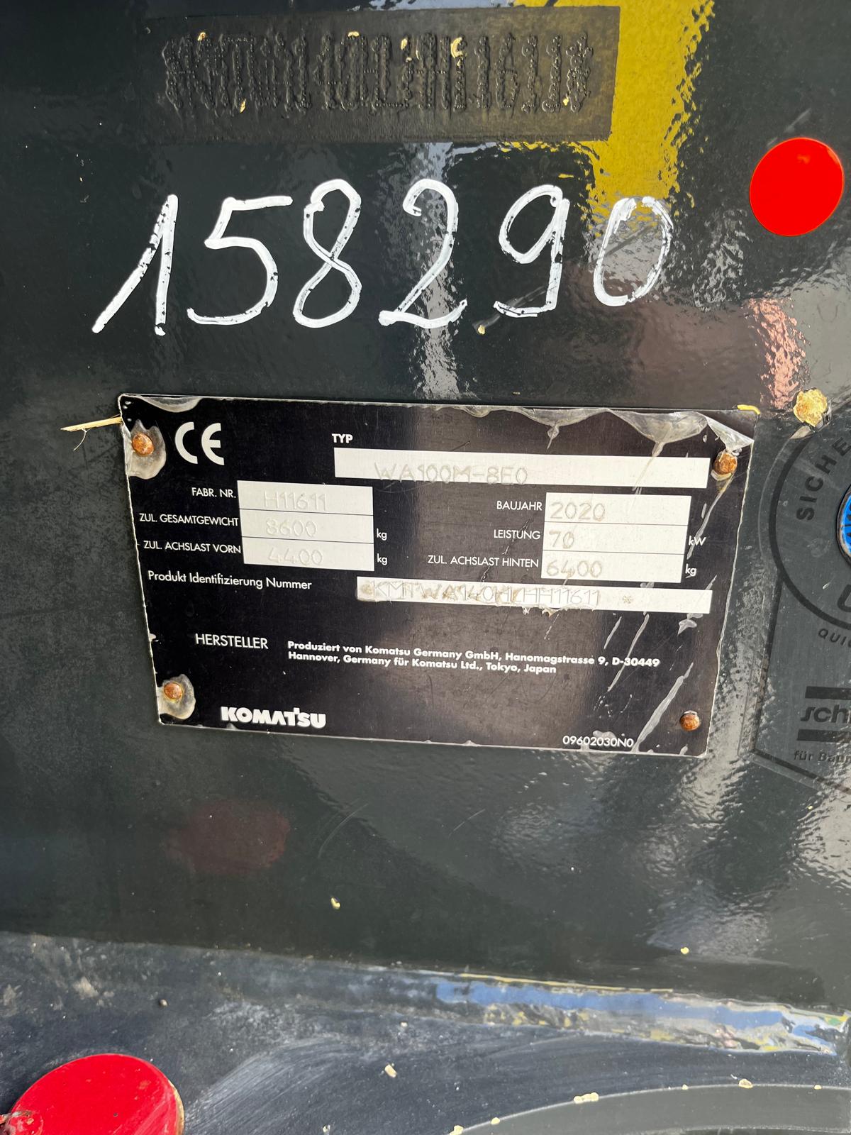 WHEEL LOADER KOMATSU WA 100 M-8E0 HYDROSTATIC DRIVE IN 20KM/H VERSION WITHOUT VARIABLE CREEP SPEED COMFORTABLE SAFETY CAB WITH TWO GLASS DOORS, CAN BE TILTED FORWARD FOR BEST MAINTENANCE ACCESS, LARGE STORAGE COMPARTMENTS, ADJUSTABLE STEERING COLUMN, BATTERY MAIN SWITCH, WARNING LAMP, WINDSHIELD WIPER WITH INTERMITTENT CONTROL, ERGONOMIC RH CONS HYDROSTATIC TRAVEL DRIVE REAR OSCILLATING AXLE TRIPLE CONTROL UNIT ADDITIONAL HYDRAULIC LINES TO SW INCL. QUICK COUPLINGS MULTIFUNCTION LEVER WITH PREPARATION FOR PROPORTIONAL CONTROL OF 3RD CONTROL CIRCUIT, SWITCH BETWEEN PROPORTIONAL CONTROL AND CONSTANT FLOW FOR 3RD CONTROL CIRCUIT, ELECTRIC LOCKING OF 3RD CONTROL CIRCUIT, SWITCH BETWEEN PROPORTIONAL CONTROL AND CONSTANT FLOW FOR 3RD CONTROL CIRCUIT.QUICK COUPLINGS MULTIFUNCTION LEVER WITH PREPARATION FOR PROPORTIONAL CONTROL OF THE 3RD CONTROL CIRCUIT,SWITCH BETWEEN PROPORTIONAL CONTROL AND CONSTANT FLOW FOR THE 3RD CONTROL CIRCUIT ELECTRIC LOCKING OF THE 3RD CONTROL CIRCUITSTANDARD COOLER (COARSE MESH) PREPARATION FOR TRAILER COUPLING KOMTRAX 1 ACOUSTIC REVERSING WARNING SYSTEM REVERSING LIGHT CE CONFORMITY HYDRAULIC PUMP WITHOUT HIGH FLOW LSD AXLES WITH LOCKING DIFFERENTIAL CAB LIFT (HYDRAULIC) GERMAN REVERSING FAN HEADLIGHTS, FOR RIGHT-HAND TRAFFIC AIR CONDITIONING CONTROL UNIT WITHOUT ECSS COMFORT SEAT, AIR SUSPENSION AND SEAT HEATING MAIN CONTROL UNIT WITH 3.TOW-AWAY DEVICE WITH PIN STD CONSERVATION LEVEL 1, FOR TRUCK TRANSPORT HORIZONTAL INDICATOR BUCKET ADDITIONAL LED WORK LIGHTS (2X FRONT, 2X REAR) DAB RADIO, ANTENNA AND LOUDSPEAKER MULTIFUNCTION LEVER WITH INTEGRATED 3 CONTROL CIRCUITS (PROPORTIONAL CONTROL) ALL-ROUND FLASHING LIGHT TIRES 405/70 R20 BK LOADER 53 BKT MULCHING BUCKET 1.3 CBM, 2,300 MM FIXED ATTACHMENT, BOLT-ON BLADE, BOLT SET