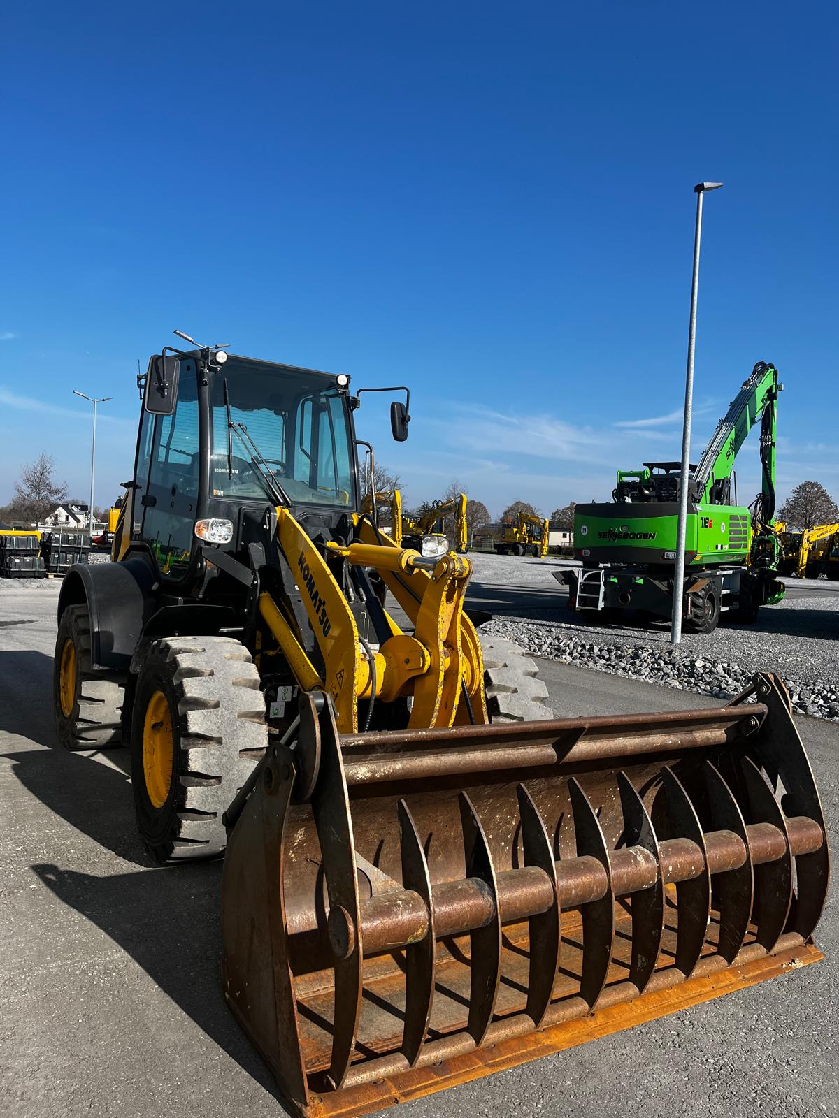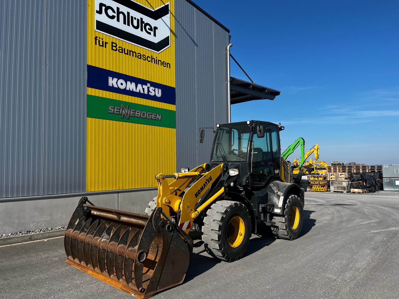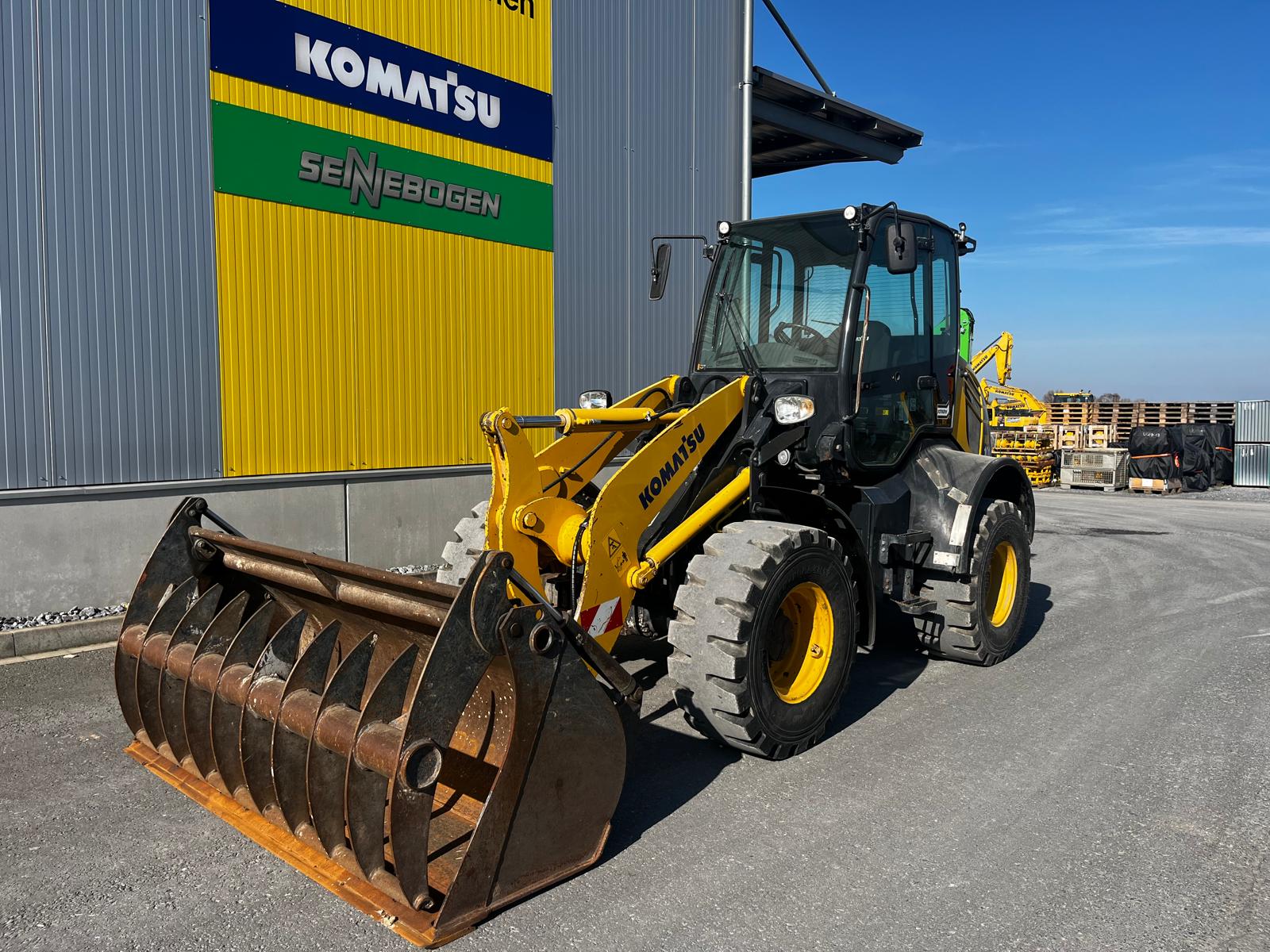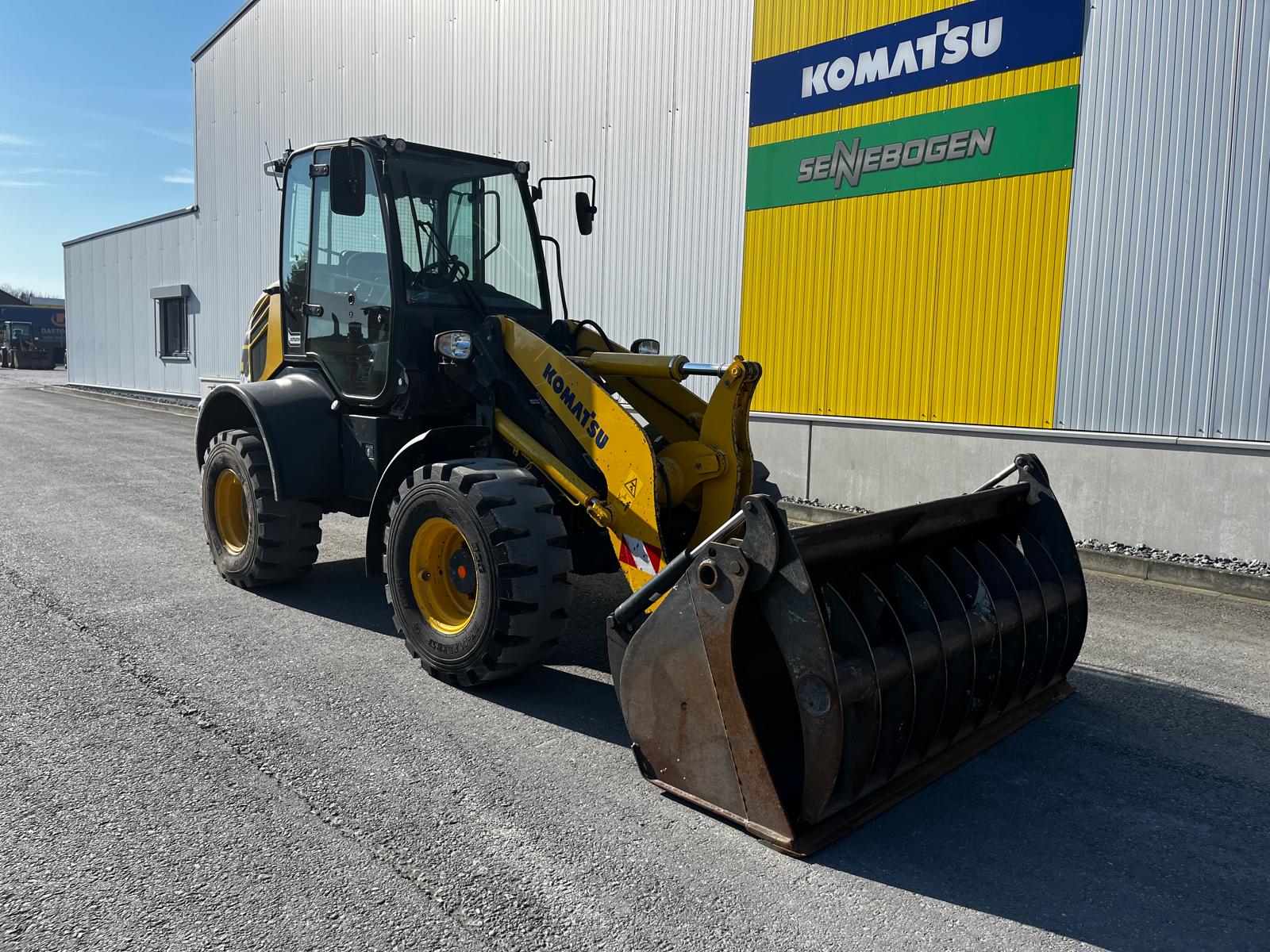 WHEEL LOADER KOMATSU WA 100 M-8E0 HYDROSTATIC DRIVE IN 20KM/H VERSION WITHOUT VARIABLE CREEP SPEED COMFORTABLE SAFETY CAB WITH TWO GLASS DOORS, CAN BE TILTED FORWARD FOR BEST MAINTENANCE ACCESS, LARGE STORAGE COMPARTMENTS, ADJUSTABLE STEERING COLUMN, BATTERY MAIN SWITCH, WARNING LAMP, WINDSHIELD WIPER WITH INTERMITTENT CONTROL, ERGONOMIC RH CONS HYDROSTATIC TRAVEL DRIVE REAR OSCILLATING AXLE TRIPLE CONTROL UNIT ADDITIONAL HYDRAULIC LINES TO SW INCL. QUICK COUPLINGS MULTIFUNCTION LEVER WITH PREPARATION FOR PROPORTIONAL CONTROL OF 3RD CONTROL CIRCUIT, SWITCH BETWEEN PROPORTIONAL CONTROL AND CONSTANT FLOW FOR 3RD CONTROL CIRCUIT, ELECTRIC LOCKING OF 3RD CONTROL CIRCUIT, SWITCH BETWEEN PROPORTIONAL CONTROL AND CONSTANT FLOW FOR 3RD CONTROL CIRCUIT.QUICK COUPLINGS MULTIFUNCTION LEVER WITH PREPARATION FOR PROPORTIONAL CONTROL OF THE 3RD CONTROL CIRCUIT,SWITCH BETWEEN PROPORTIONAL CONTROL AND CONSTANT FLOW FOR THE 3RD CONTROL CIRCUIT ELECTRIC LOCKING OF THE 3RD CONTROL CIRCUITSTANDARD COOLER (COARSE MESH) PREPARATION FOR TRAILER COUPLING KOMTRAX 1 ACOUSTIC REVERSING WARNING SYSTEM REVERSING LIGHT CE CONFORMITY HYDRAULIC PUMP WITHOUT HIGH FLOW LSD AXLES WITH LOCKING DIFFERENTIAL CAB LIFT (HYDRAULIC) GERMAN REVERSING FAN HEADLIGHTS, FOR RIGHT-HAND TRAFFIC AIR CONDITIONING CONTROL UNIT WITHOUT ECSS COMFORT SEAT, AIR SUSPENSION AND SEAT HEATING MAIN CONTROL UNIT WITH 3.TOW-AWAY DEVICE WITH PIN STD CONSERVATION LEVEL 1, FOR TRUCK TRANSPORT HORIZONTAL INDICATOR BUCKET ADDITIONAL LED WORK LIGHTS (2X FRONT, 2X REAR) DAB RADIO, ANTENNA AND LOUDSPEAKER MULTIFUNCTION LEVER WITH INTEGRATED 3 CONTROL CIRCUITS (PROPORTIONAL CONTROL) ALL-ROUND FLASHING LIGHT TIRES 405/70 R20 BK LOADER 53 BKT MULCHING BUCKET 1.3 CBM, 2,300 MM FIXED ATTACHMENT, BOLT-ON BLADE, BOLT SET