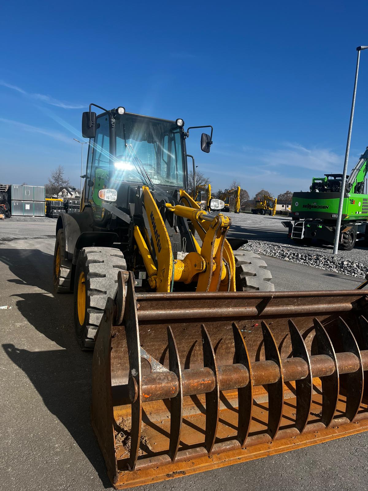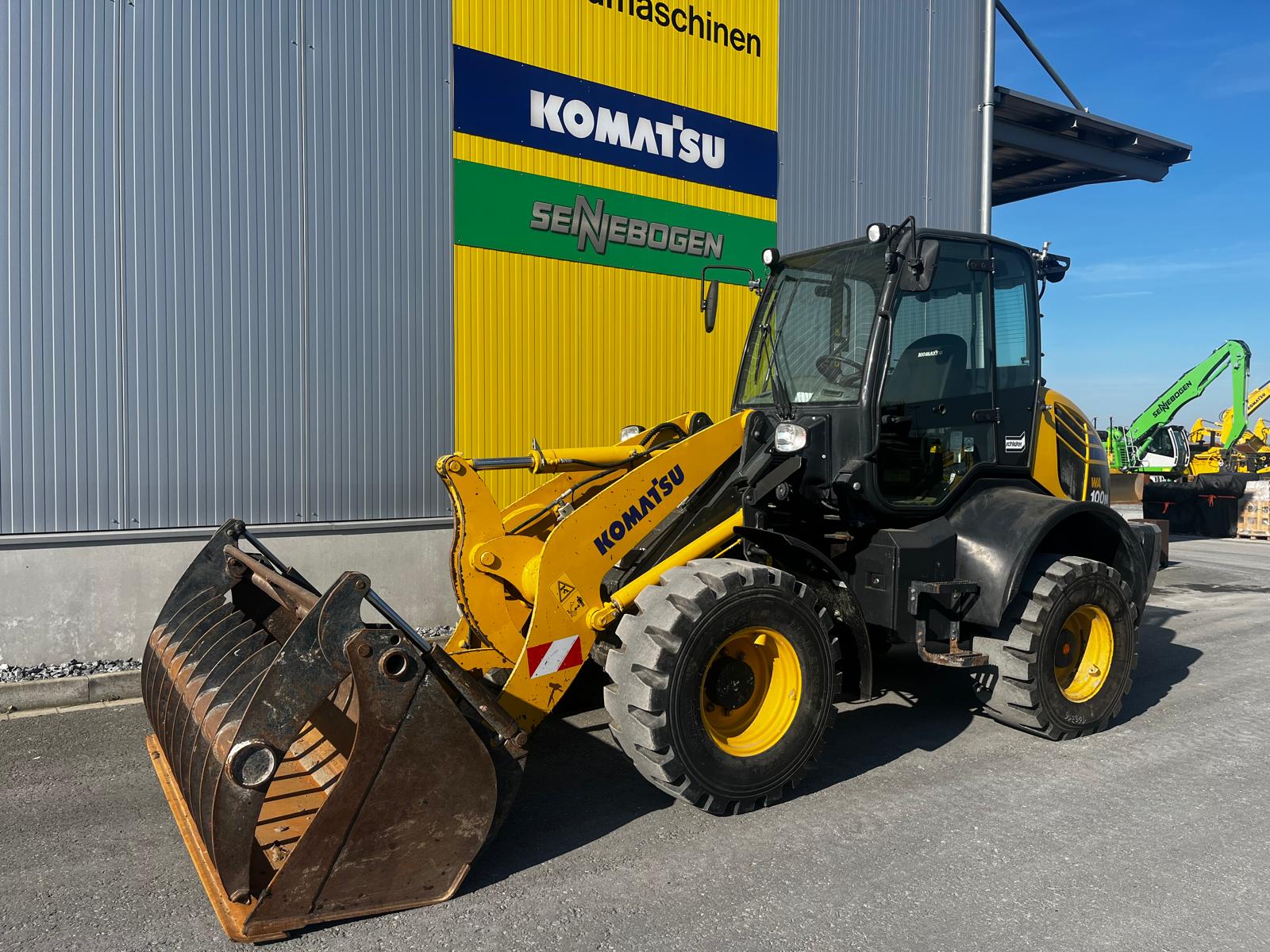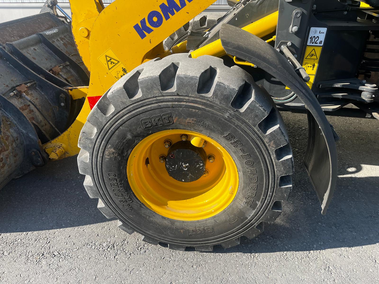 WHEEL LOADER KOMATSU WA 100 M-8E0 HYDROSTATIC DRIVE IN 20KM/H VERSION WITHOUT VARIABLE CREEP SPEED COMFORTABLE SAFETY CAB WITH TWO GLASS DOORS, CAN BE TILTED FORWARD FOR BEST MAINTENANCE ACCESS, LARGE STORAGE COMPARTMENTS, ADJUSTABLE STEERING COLUMN, BATTERY MAIN SWITCH, WARNING LAMP, WINDSHIELD WIPER WITH INTERMITTENT CONTROL, ERGONOMIC RH KONS HYDROSTATIC TRAVEL DRIVE REAR OSCILLATING AXLE TRIPLE CONTROL UNIT ADDITIONAL HYDRAULIC LINES TO SW INCL. QUICK COUPLINGS MULTIFUNCTION LEVER WITH PREPARATION FOR PROPORTIONAL CONTROL OF 3RD CONTROL CIRCUIT, SWITCH BETWEEN PROPORTIONAL CONTROL AND CONSTANT FLOW FOR 3RD CONTROL CIRCUIT QUICK COUPLER PREPARATION WITHOUT QUICK COUPLERSQUICK COUPLINGS MULTIFUNCTION LEVER WITH PREPARATION FOR PROPORTIONAL CONTROL OF THE 3RD CONTROL CIRCUIT, SWITCH BETWEEN PROPORTIONAL CONTROL AND CONSTANT FLOW FOR THE 3RD CONTROL CIRCUIT QUICK COUPLER PREPARATION, WITHOUT QUICK COUPLER LOCKING OF THE 3RD CONTROL CIRCUITSTANDARD COOLER (COARSE MESH) PREPARATION FOR TRAILER COUPLING KOMTRAX 1 ACOUSTIC REVERSING WARNING SYSTEM REVERSING LIGHT CE CONFORMITY HYDRAULIC PUMP WITHOUT HIGH FLOW LSD AXLES WITH LOCKING DIFFERENTIAL CAB LIFT (HYDRAULIC) GERMAN REVERSING FAN HEADLIGHTS, FOR RIGHT-HAND TRAFFIC AIR CONDITIONING CONTROL UNIT WITHOUT ECSS COMFORT SEAT, AIR-SUSPENDED AND SEAT HEATING MAIN CONTROL UNIT WITH 3.TOW-AWAY DEVICE WITH BOLT STD CONSERVATION LEVEL 1, FOR TRUCK TRANSPORT HORIZONTAL INDICATOR BUCKET ADDITIONAL WORKING LIGHTS, STANDARD (2 X FRONT, 2 X REAR) MULTIFUNCTION LEVER WITH INTEGRATED 3 CONTROL CIRCUITS (PROPORTIONAL CONTROL) DAB RADIO, ANTENNA AND LOUDSPEAKER ALL-ROUND FLASHING LIGHT TYRES 405/70 R20 BK LOADER 53 BKT 1.3 CBM MULCH GRAB BUCKET, 2,300 MM FIXED ATTACHMENT, BOLT-ON SEER