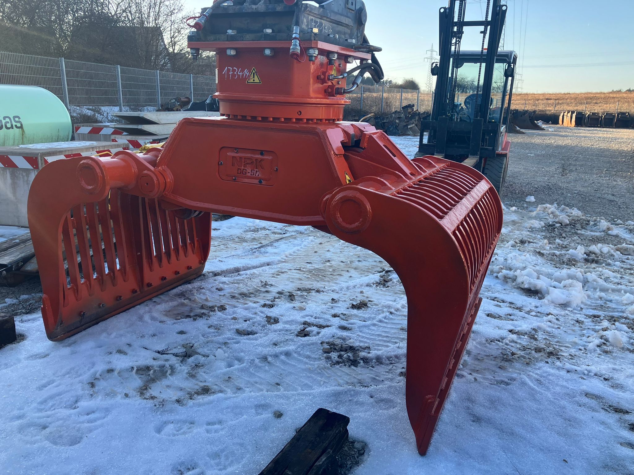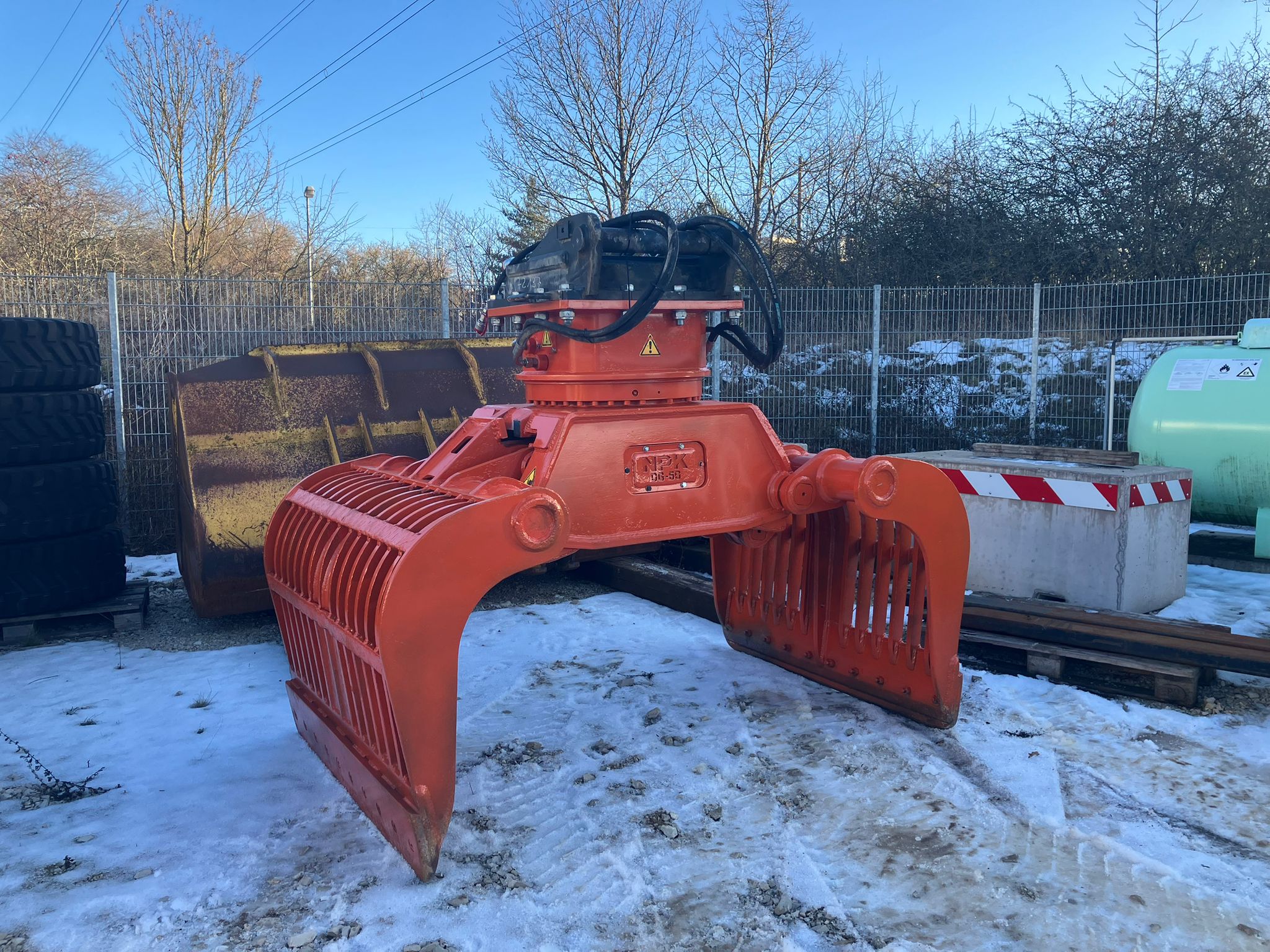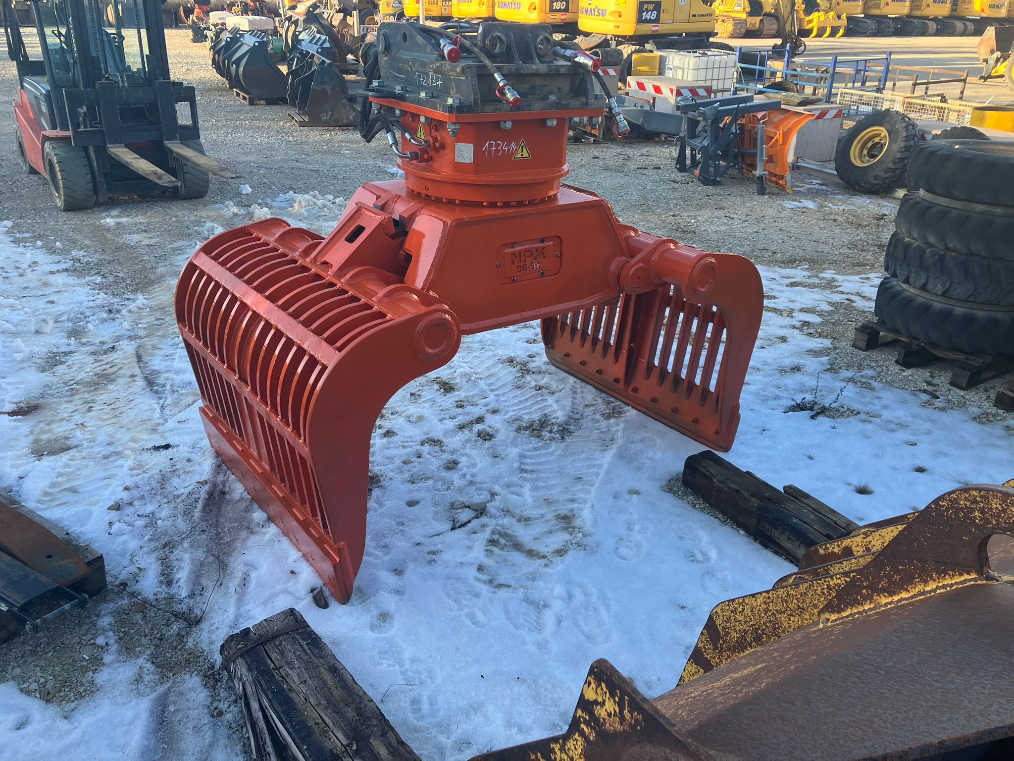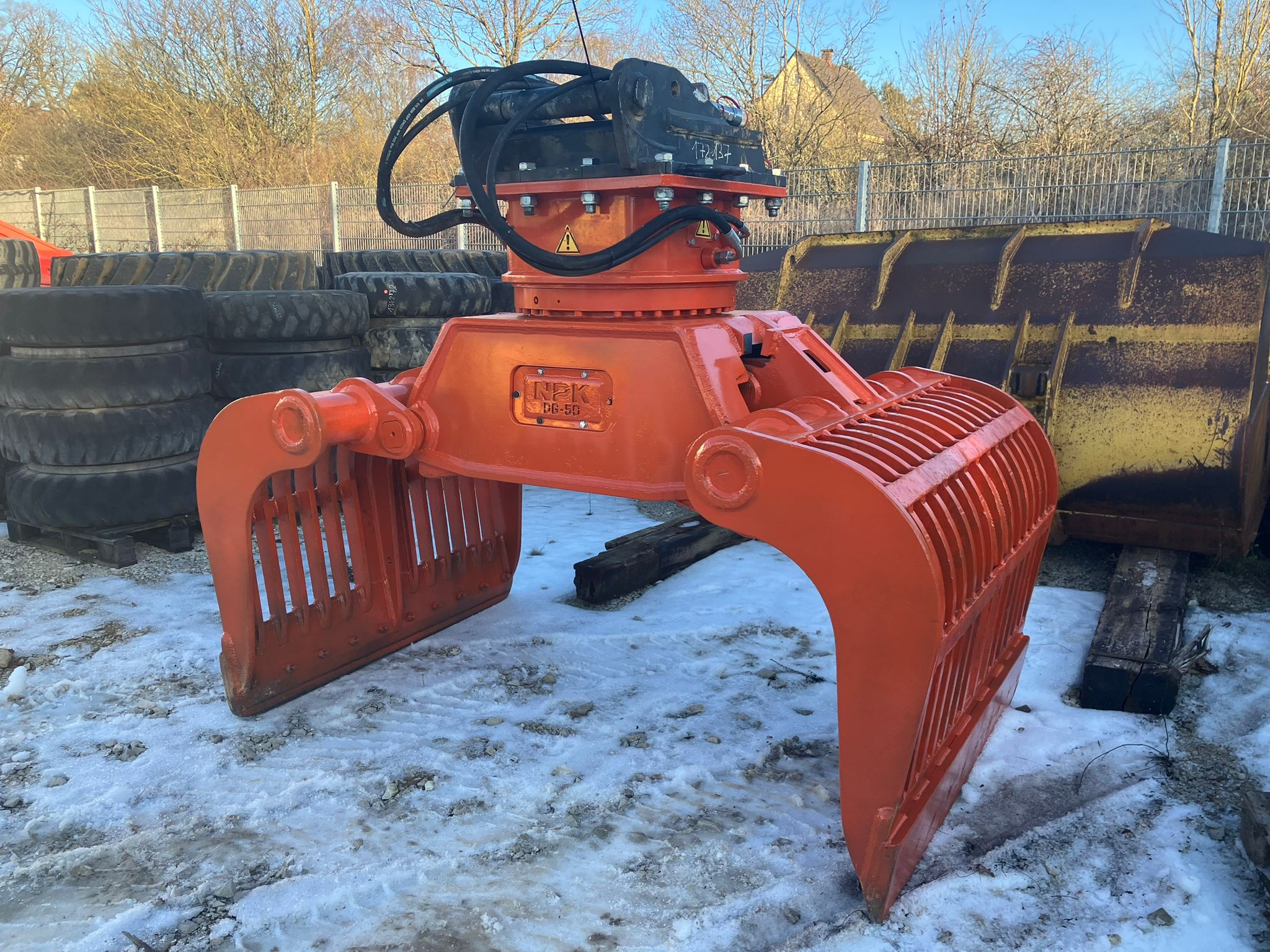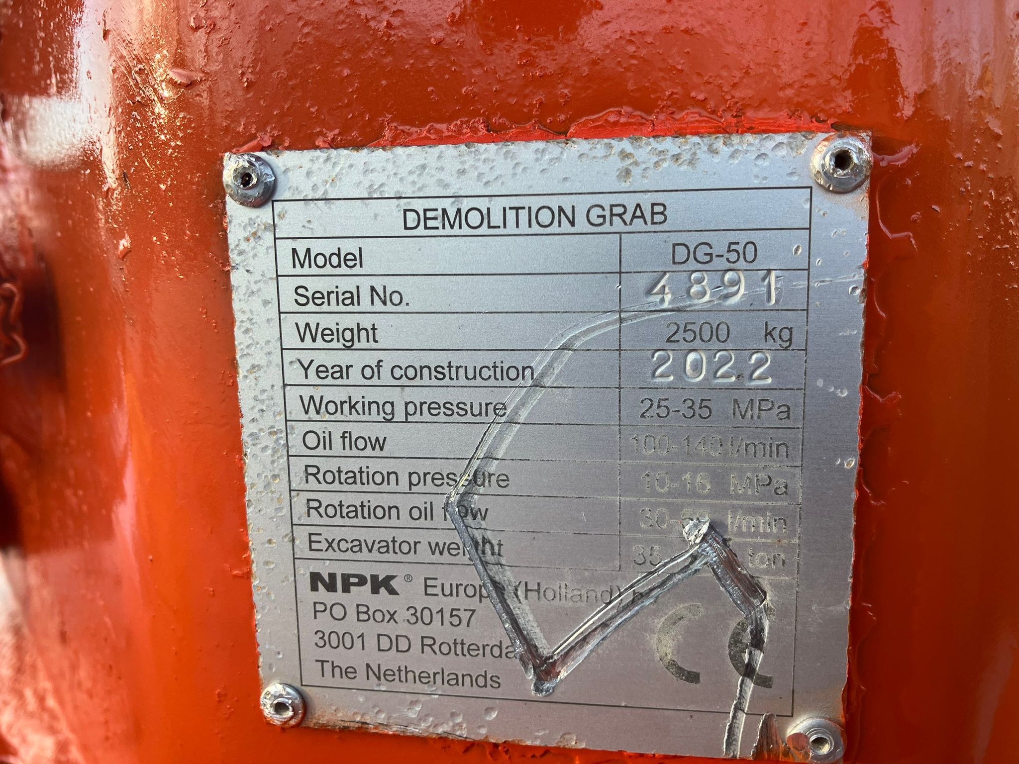 ABBRUCHGREIFER NPK DG-50, HYDRAULISCH DREHBAR,2 DREHMOTOREN UND WECHSELBAREN WENDEMESSER EINSATZGEWICHT: 35,0 TO. - 50,0 TO. EIGENGEWICHT: 2.500 KG 3.800 KG MIT ADAPTER GREIFERSCHALE MIT RIPPE ABMAßE:ÖFFNUNGSWEITE: 2.450 MM SCHALENBREITE: 1.450 MM HÖHE OHNA ADAPTER: 1.560 MM KAPAZITÄT: 1.100 LTR. BETRIEBSDRUCK: 250 - 350 BAR ÖLMENGE: 100 - 140 L/MIN SCHLIEßKRAFT: 90 KN DREHMOTOR BETRIEBSDRUCK: 100 - 160 BAR ÖLMENGE: 30 - 50 L/MIN GREIFERSCHALE MIT LOCHBLECH ODER MIT SCHALEN KOMPLETT GESCHLOSSEN Adapterplatte MS21 (SCHL)