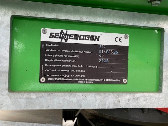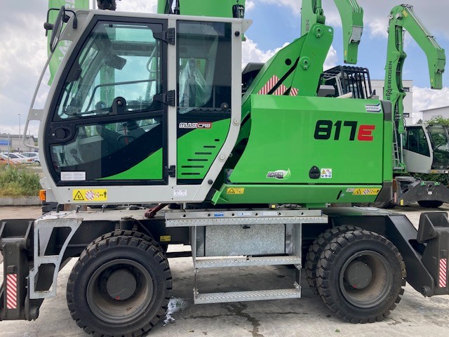 UMSCHLAGMASCHINE SENNEBOGEN 817 M -SERIE E-(EU STUFE V/TIER 4 FINAL)100 KW MOBILUNTERWAGEN MP17E MIT 4-PUNKT-ABSTÜTZUNG PAH4 VOLLGUMMIREIFEN 9.00-20 (8-FACH) JOYSTICKLENKUNG AUFSTIEG MIT WERKZEUGKASTEN ZUSATZBALLAST 0,5 T IM GEGENGEWICHT INTEGRIERT KABINENVERSTELLUNG E240,MULTICAB SENNEBOGEN MULTICAB KOMFORTFAHRERKABINE LUFTGEFEDERTER KOMFORT-FAHRERSITZ SICHERHEITSGURT / 2 ZOLL KABINENFRONTSCHEIBE IN PANZERGLAS- AUSFÜHRUNG DACHFENSTER IN PANZERGLASAUSFÜHRUNG SCHEIBENWISCHER FÜR DACHSCHEIBE SONNENROLLO FÜR DACHFENSTER, INNEN SONNENROLLO FÜR FRONTSCHEIBE, INNEN RADIO MIT USB, MP3, BLUETOOTH STANDARD BETRIEBSSTOFFE (OHNE HYDRAULIKÖL) HYDRAULIKÖL SHELL TELLUS S2 VA 46 KAMERASYSTEM MIT 2 KAMERAS SENNEBOGEN HYDRO-CLEAN AUTOMATISCHE ZENTRALSCHMIERUNG FÜR AUSRÜSTUNG UND DREHKRANZLAUFBAHN K9 ARBEITSAUSRÜSTUNG: 5,3M + 3,8M SCHNELLWECHSELKUPPLUNGEN SCHRAUBBAR MIT GEGENSTÜCKEN AUSLEGERDÄMPFUNG BARGRAPH DRUCK-ANZEIGE (HUBZYLINDER)IM SENCON MIT AKUSTISCHER WARNUNG STANDARDLACKIERUNG RAL 7038 / RAL 6018 / RAL 7022 2 LED SCHEINWERFER AM STIEL: JE 1 ST. LINKS, 1 ST. RECHTS 1 LED SCHEINWERFER AM KOMPAKTAUSLEGER UNTEN BEDIENUNGS- UND WARTUNGSANLEITUNG IN DEUTSCHER UND ENGLISCHER SPRACHE DIGITALER ERSATZTEILKATALOG SENTRACK TELEMETRIESYSTEM INKL. VERBINDUNGSGEBÜHREN (STANDARD SIM)
